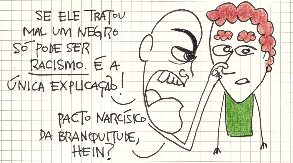 A tese do “pacto narcísico da branquitude” é realmente uma tese. Foi apresentada por Cida Bento, para obtenção do título de doutora, ao Departamento de Psicologia da USP. Pretendo lê-la um dia, mas no momento me contentarei com as sínteses de terceiros. Djamila Ribeiro explica: