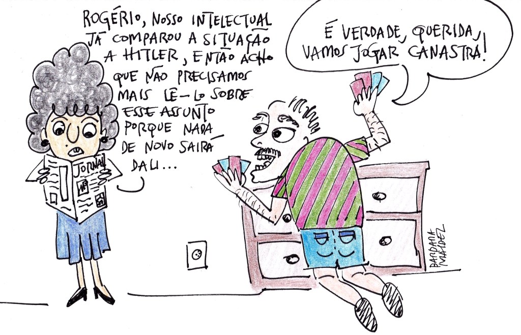 Se por um lado é cinismo fingir que Bolsonaro é um mero vereador maluco, como alguns liberais e alguns gazeteiros populares têm feito, por outro é de dar pena – o sentimento de inferiorização – quando um intelectual que só sabe falar disso e não vê mais nada na frente do nariz parece querer medalhas pela sua rotinária “bravura” ante um desgoverno já bastante malquisto no meio que esse intelectual frequenta. Dá pra exigir mais dos estudiosos que foram oferecidos pra pautar Cultura & Sociedade. Afinal, os críticos que comparam tudo de que não gostam a Hitler não têm mais nada pra desenvolver. Há muito mais coisas acontecendo simultaneamente, e as análises fáceis, exclamativas, feitas por alguns deles parecem só servir a uma audiência bruta que pretende matar tempo até ser sepultada ou cremada. Uma audiência que podia substituir tudo isso por jogos de baralho e então descongestionar a internet.