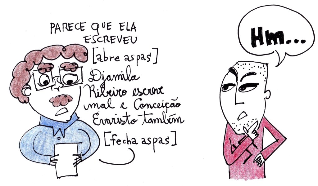 O que me recuso a compreender é a ausência de crítica desvantajosa sobre a obra de uma autora que já foi recomendada em vestibulares, que um grupo tentou alçar à Academia Brasileira de Letras com um abaixo-assinado – se é assim vamos fazer enquetes na internet – e que ativistas conseguiram entuchar nos meios de comunicação só em tons elogiosos. Nem Machado de Assis alcançou essa unanimidade – o já citado Agrippino o criticava, bem como Guimarães Rosa –, então somos abraçados sem consentimento por qual maldito espírito cultural pra que essa questão seja interditada? Na seção de comentários de um perfil que divulgava uma entrevista de Conceição, postei: “tem uma louvável história de superação da pobreza, mas escreve muito mal”. Em poucos minutos recebi o teto dos xingamentos: “nazista”. Não vale a pena tentar me defender de uma excrescência dessas, mas tenho certeza que nenhum real adepto do nazismo vai me enviar convite pra participar do movimento por causa de um inofensivo comentário sobre as habilidades literárias de alguém.
