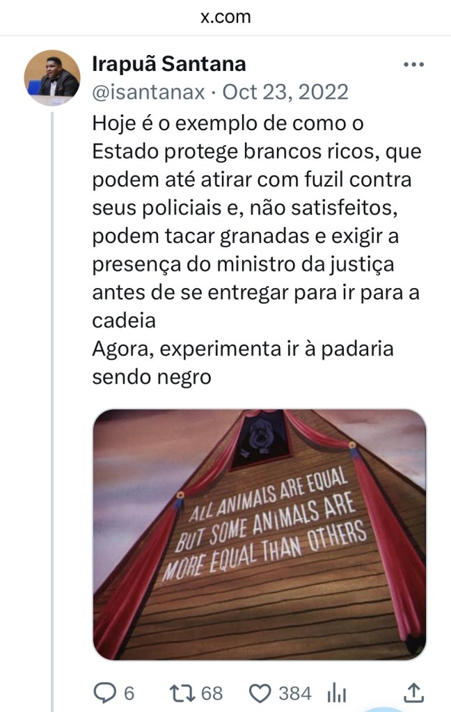 Voltarei a Irapuã quando escrever sobre a maior manifestação do racismo à brasileira: o racismo amigável, condescendente, que mesmo pessoas alinhadas ao centro, à direita e à centro-direita adotam quando tratam qualquer negro não esquerdista como um tipo de campeão intocável, um mascote, “nós também temos o nosso negro”.