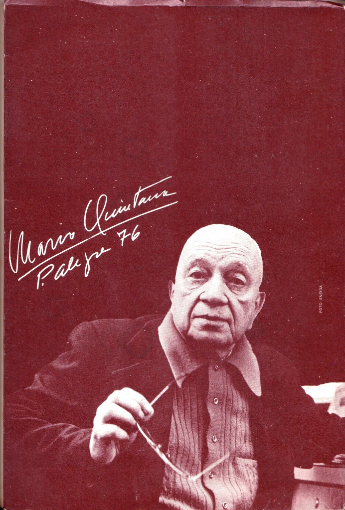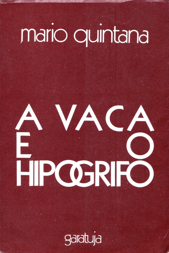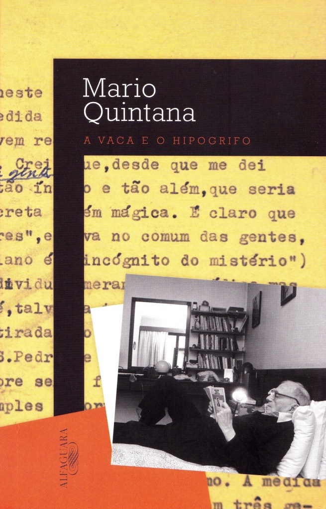 1. Estava lendo A vaca e o hipogrifo, de Mário Quintana, na edição da Coleção Folha Grandes Escritores Brasileiros, saída em 2008. Falta amor estético em algumas coleções que a Folha de S.Paulo comercializa — os livros parecem feitos pelas mãos geladas dum analista contábil que arranja complemento salarial como capista e diagramador —, então fui buscar o título na edição que a Alfaguara tinha lançado em 2012. Agradável, com a capa mostrando um Quintana que parece performar uma leitura pra retrato, mas de tipografia blog-de-poetisa num tamanho miúdo, mesmo diante de tanto espaço no papel.
