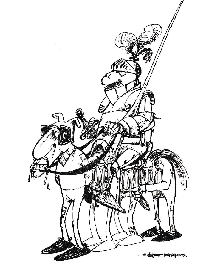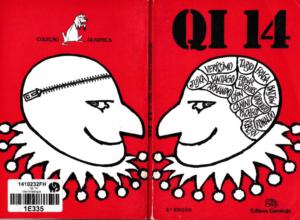 Nessa edição os minicontos, máximas e poemas de A vaca e o hipogrifo estão uns atrás dos outros — modelo econômico que prefiro, embora a Garatuja pudesse ter deixado folgas um pouco maiores entre um texto e o seguinte. Também desaprovo que tudo esteja em itálico, como na Círculo do Livro, tornando cansativa a ênfase plena. Mesmo assim me interessaram as belas capa e contracapa duma editora já morta e que trabalhava fora do hegemônico Sudeste. Foi buscando títulos da Garatuja em sebos que o André descobriu pra nós a compilação QI 14, de 1975, que reúne quatorze humoristas e chargistas gaúchos: Armando Coelho Borges, Batsow, Canini, Edgar Vasques, Edson, Fraga, Juska, Luis Fernando Verissimo, Pacheco, Rekern, Ronaldo, Santiago, Tarso e Torquato Ssó.