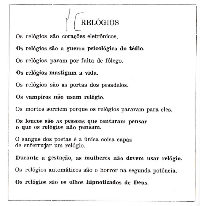 Estouram crimes e transtornos, perigos e delícias: ¡vive-se! “Um táxi cai no riacho e lidera um lento cortejo de dejetos até o rio”, e mulheres em harmonia de vestimentas coreografam pombas: “há uma revoada de datilógrafas na Praça do Portão”. Até Quintana se atrasa prum compromisso com ele mesmo às 6, e lá adiante “um mendigo vira príncipe na esquina da Uruguai”.