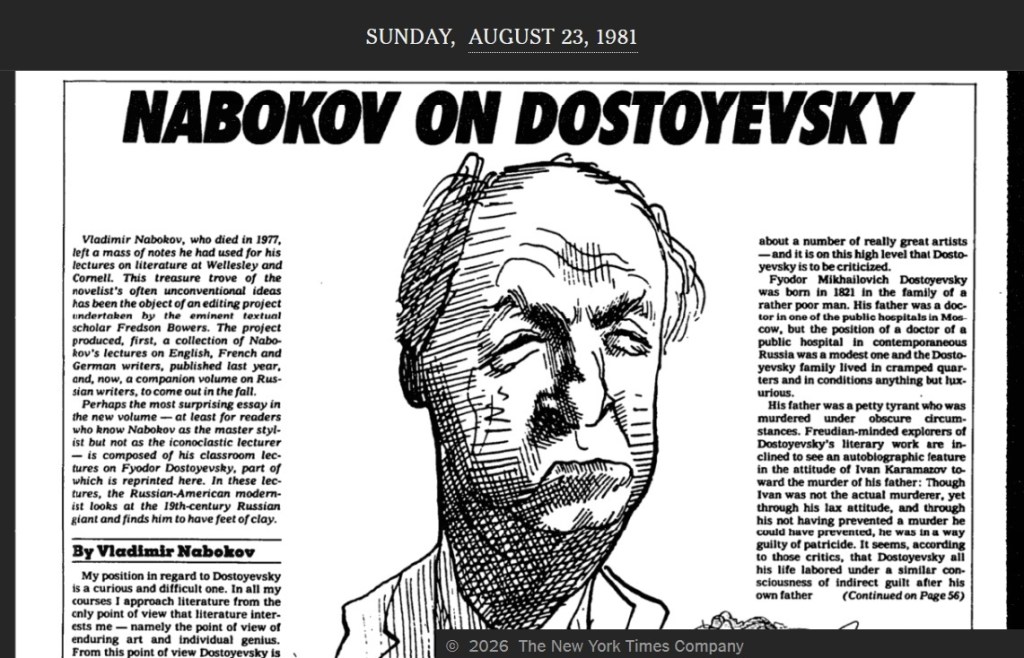 Justo ou injusto — faz tempo que não leio Dostoiévski, e nos últimos anos parte do meu juízo literário mudou —, Nabokov sentiu essa incompatibilidade de continente e conteúdo n’Os irmãos Karamázov. Num texto republicado na The New York Times Magazine em 23 de agosto de 1981, ele tenta nos persuadir das falhas de seu conterrâneo — “escritor medíocre”, “com centelhas de excelente humor em vastos campos de banalidades” — e sustenta que Dostoiévski errou de profissão. Em tradução leiga: